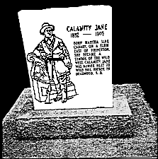 (This photo was taken while on a research trip to Princeton, Mercer County, Missouri, and the marker is found in the town square, not in a cemetery. The inscription reads "Calamity Jane 1852 - 1903 Born Maratha Jane Canary, on a farm east of Princeton. She became a symbol of the wild west Calamity Jane was buried next to Wild Bill Hitcock in Deadwood, S.D."